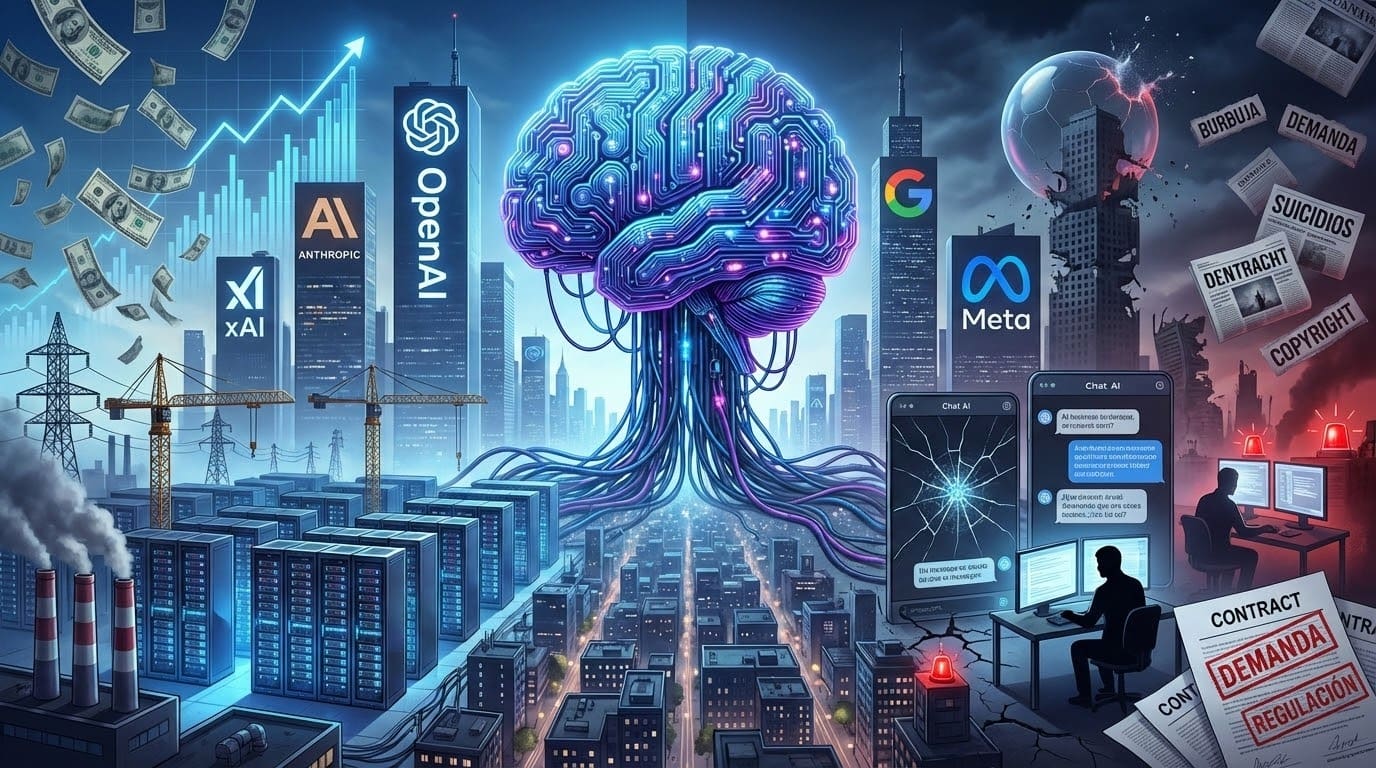 En 2025 la industria de la inteligencia artificial vivió una mezcla explosiva de dinero fácil, grandes promesas y un duro baño de realidad. Gigantes como OpenAI, Anthropic y xAI levantaron rondas de financiación históricas —OpenAI cerró 40.000 millones de dólares y aspira a una valoración cercana al billón— mientras startups casi sin producto, como Thinking Machine Labs o Lovable, alcanzaban valoraciones de miles de millones. Todo ello se sostiene sobre un enorme esfuerzo de infraestructura: proyectos colosales de centros de datos, acuerdos circulares entre fabricantes de chips, nubes y laboratorios, y compromisos de gasto que rozan los 1,3 billones de dólares. Sin embargo, empiezan a aparecer grietas: socios financieros que se retiran, límites de la red eléctrica, oposición política a los centros de datos y dudas sobre si la demanda real justifica tanta inversión.