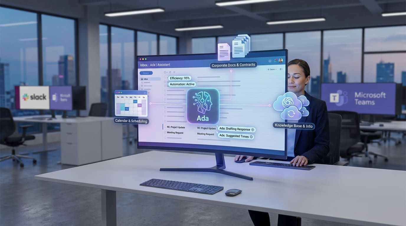 Ada se conecta al calendario y responde en tu nombre para encontrar horarios de reunión, proponiendo nuevas franjas si la otra persona no puede, sin revelar el contenido de tus citas. También puede contestar preguntas apoyándose en la base de conocimiento interna de la empresa, en resúmenes de reuniones previas y en búsquedas públicas en internet; por ejemplo, puede informar cómo avanza el cumplimiento de objetivos trimestrales. Además, redacta borradores de respuesta cuando alguien hace una consulta en un hilo de correo y te permite revisarlos antes de enviarlos, prometiendo no compartir información sensible sin tu autorización.